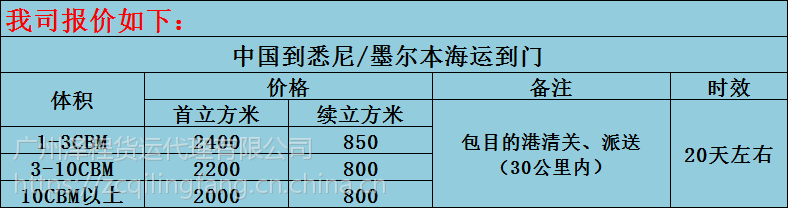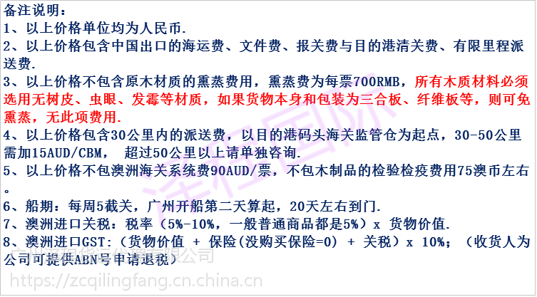 双清模式:在起始港口费用会稍微高点,但是目的港口除了澳洲的进口税费用(公司收货的话可以抵营业税),就没有其它费用了。而且港口30公里以内可以免费送货到门。我们全包服务。