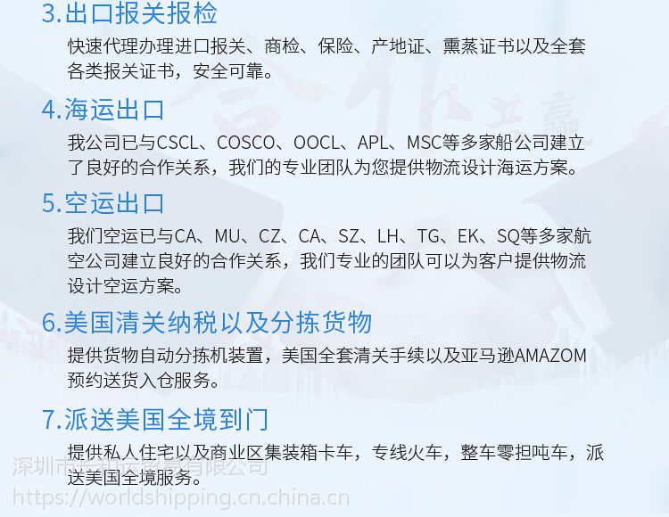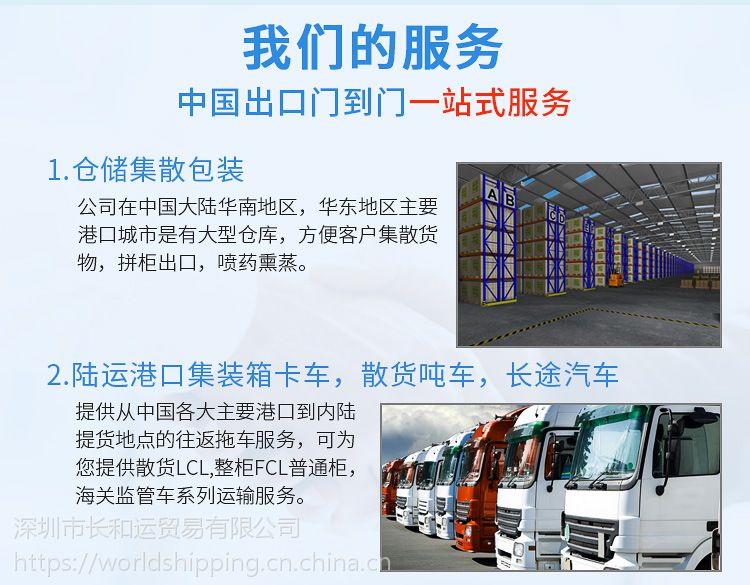 【服务范围】:拼箱,整柜,陆运拖车,仓储、配送,代理报关,清关,保险。***的目的港服务,满足客户各种需求