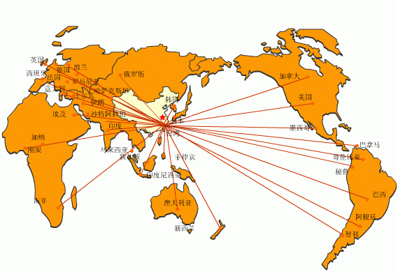 东南亚各国:日本、台湾,新加坡,泰国,马来西亚,菲律宾,韩国,文莱,越南,印度,印度尼西亚,柬埔寨,老挝