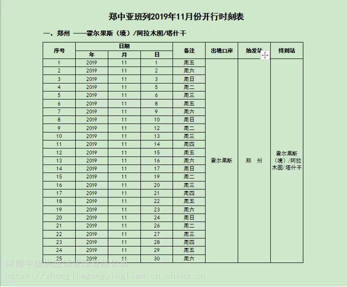 郑州——霍尔果斯境/阿拉木图/塔什干,常态开行,每周出口2班(周三、周五)